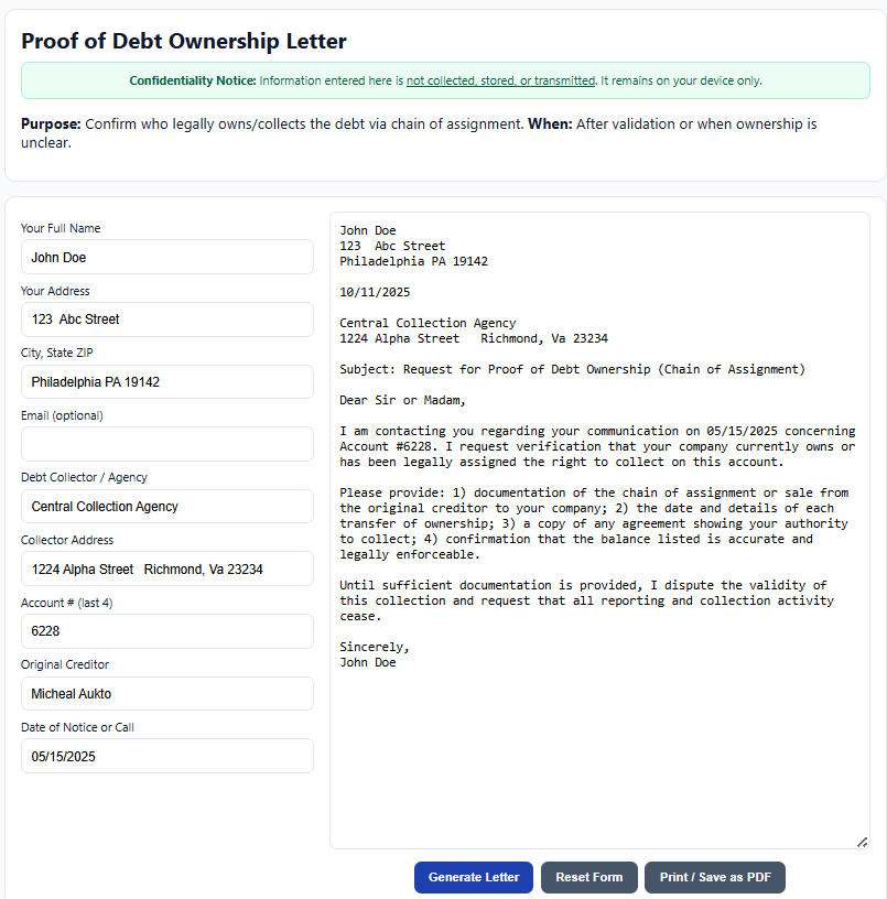A Proof of Debt or Ownership Request Letter goes deeper than a validation letter — it asks the collector to show exactly how the debt was transferred, sold, or assigned to them. It’s designed to confirm the chain of custody from the original creditor to the current collector. When to Use: